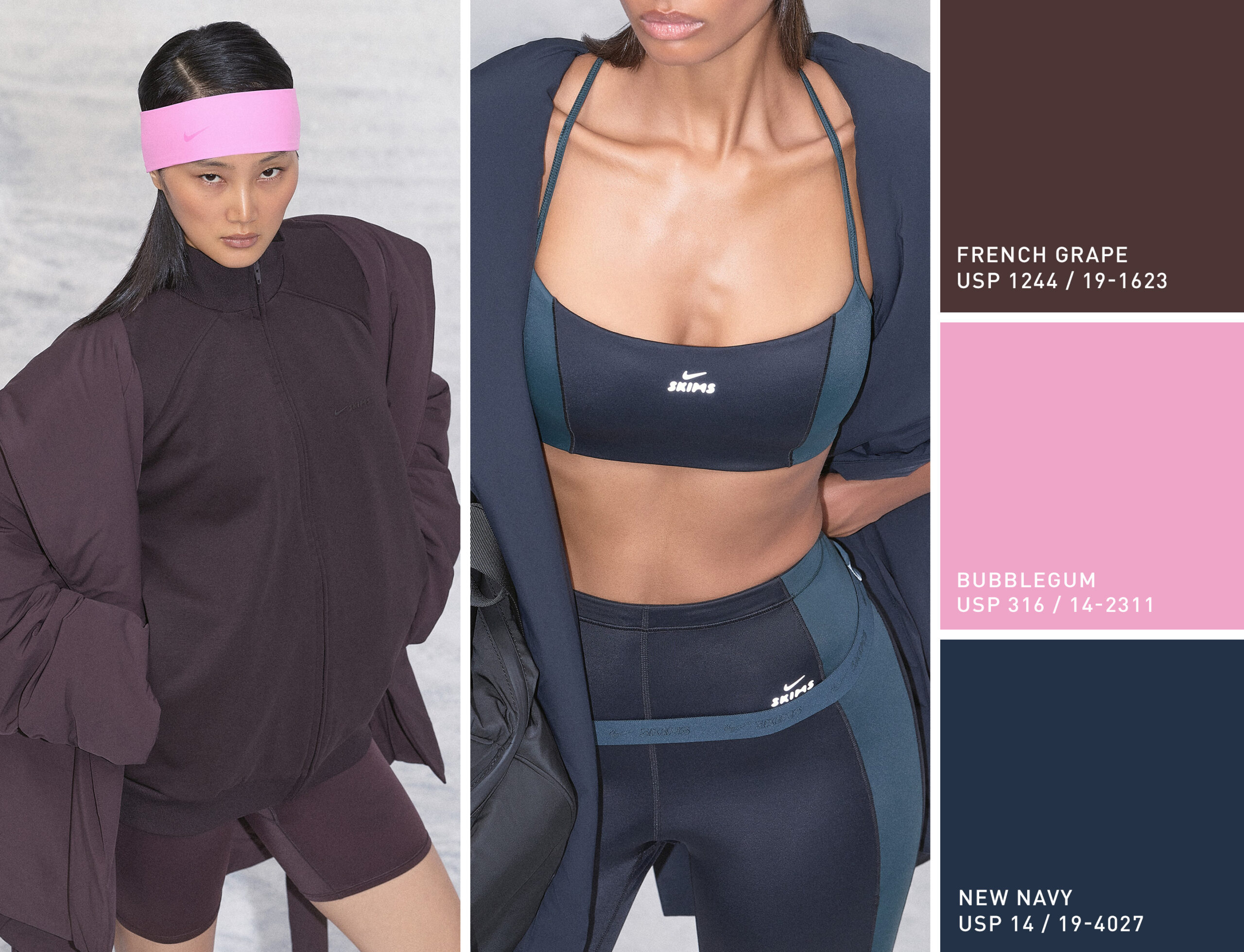 NikeSKIMS returns with their second collaborative drop. 65 new silhouettes shape a new aesthetic where style and sport are inseparable. The collection focuses on three different material collections; Shine, Matte and Airy – in new neutral tones of New Navy and French Grape with fun pops of Bubblegum.