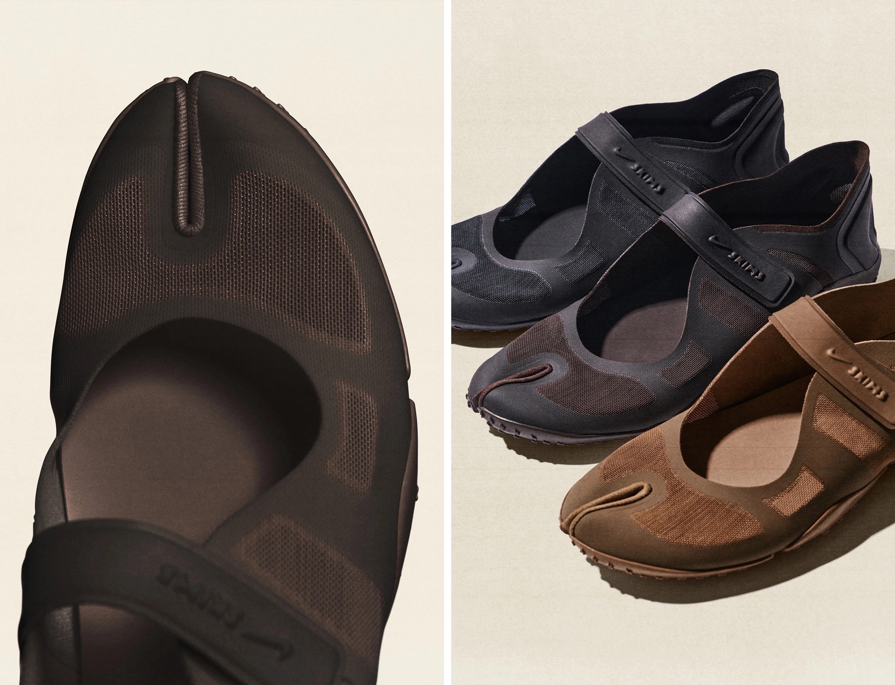 NikeSKIMS has applied its considered design ethos to footwear for the first time, beginning with the NikeSKIMS Rift. The split-toe running silhouette, originally launched in the ’90s, has been given a contemporary twist through sleek new design changes and tones of Charcoal, Bitter Chocolate and Toffee.