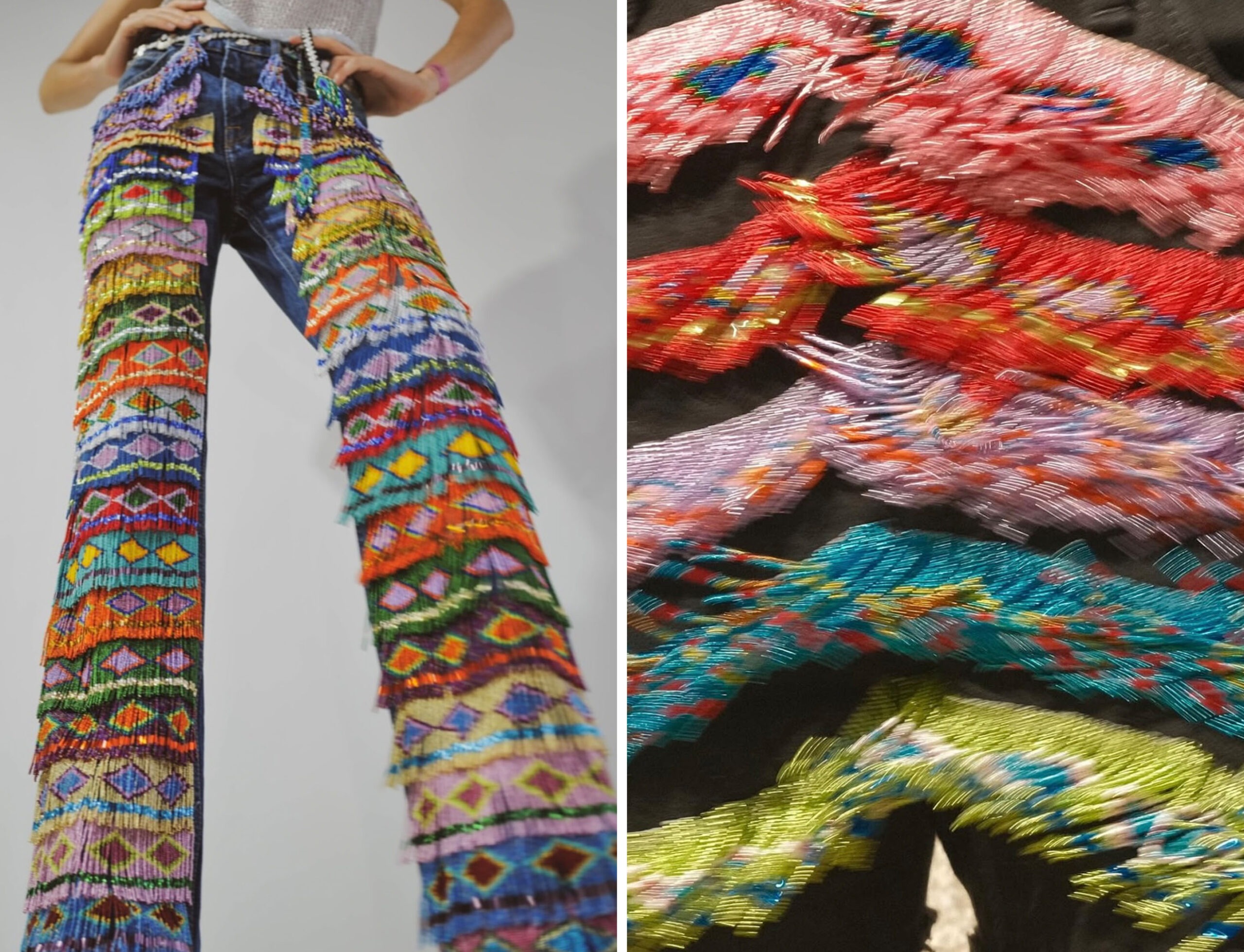 Colombian fashion brand Derive Afburen celebrates its roots in artisanal craft and heritage textiles. Vibrant, handcrafted beadwork tells a rich visual story through conscious maximalism, geometric motifs and folkloric stripes, saturated in bold, joyful colour.