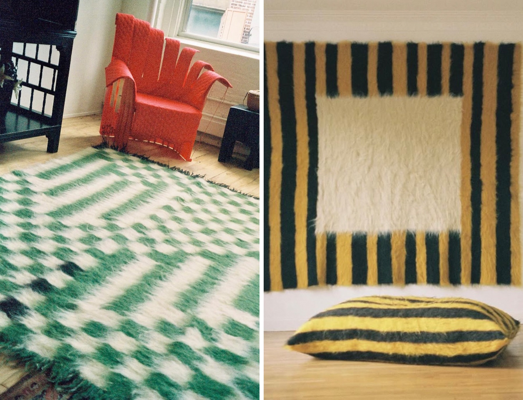 Grace Atkinson’s textile work explores bold, graphic print and pattern through playful contrasts in colour and texture, organic motifs with structured, stripes and checks on tactile surfaces. The statement patterns bring warmth and personality to interior spaces.
